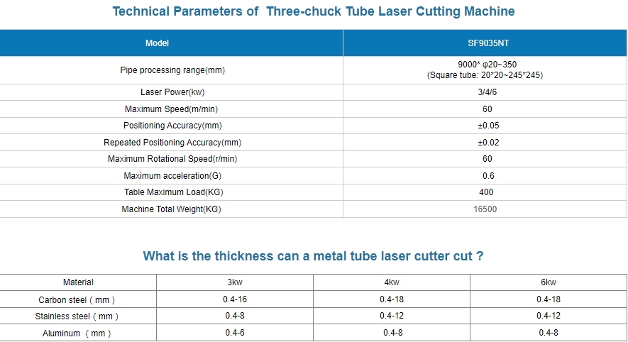 SF9035NT is a tube laser cutting machine with larger processing capacity: tube length increased to 9 meters and diameter to 350mm, cutting different profiles, such as round tube, square tube, rectangular tube, L, U and H profiles. With a moving chuck in the middle, three-chuck design can ensure actual “0” tailing with better accuracy and stable performance. Advanced bus CNC system and cutting software help achieve high-speed flash cutting.