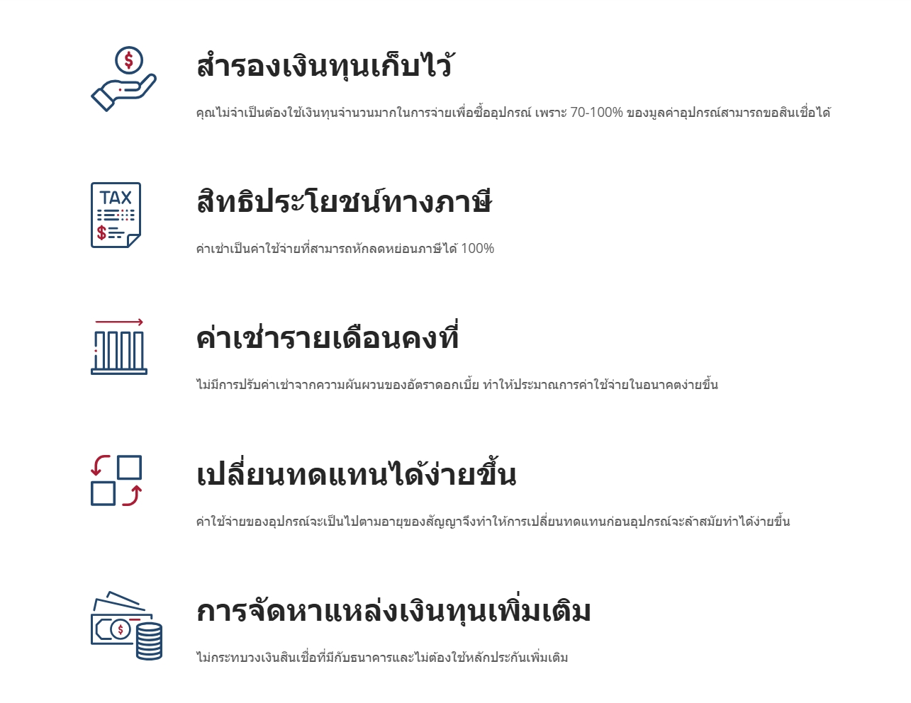 สำหรับหลายๆบริษัท การทำลีสซิ่งช่วยให้คุณสามารถขยายธุรกิจได้โดยไม่ต้องสละเงินทุนอันมีค่าของคุณ