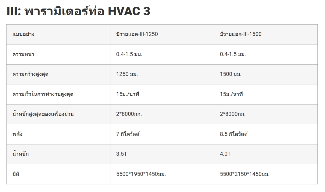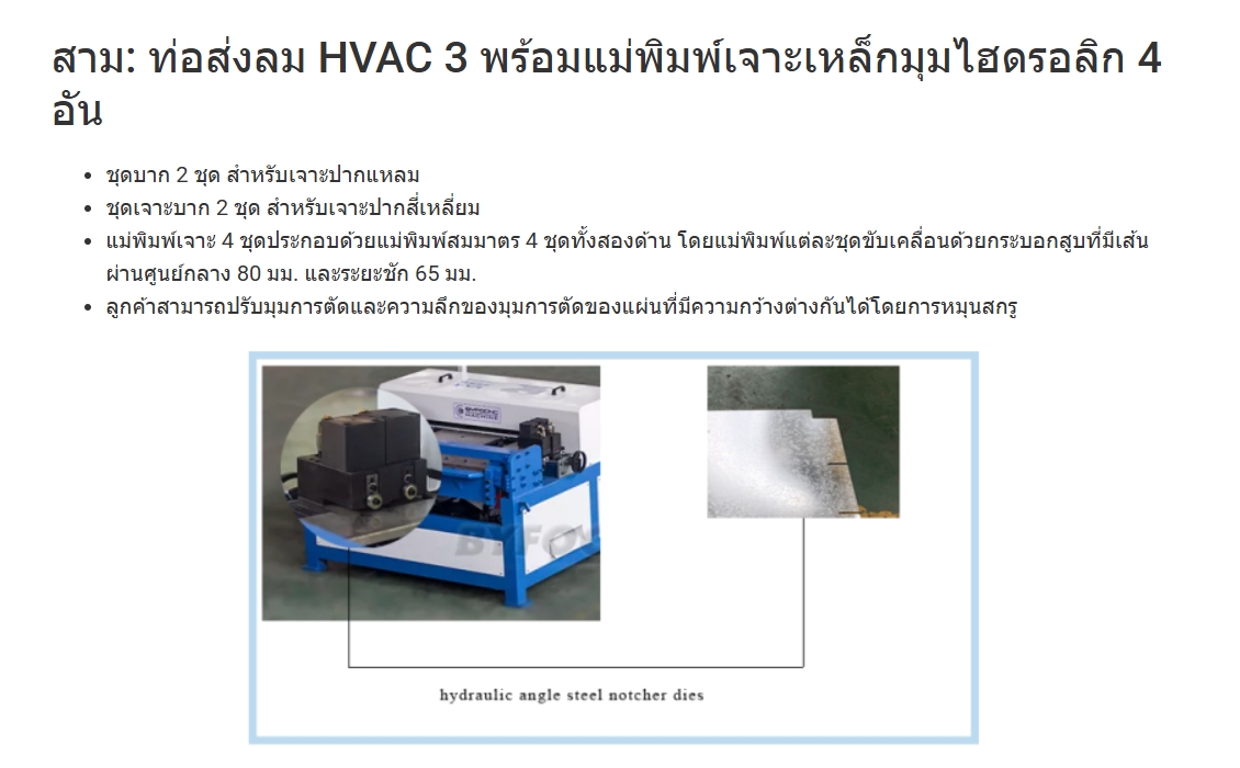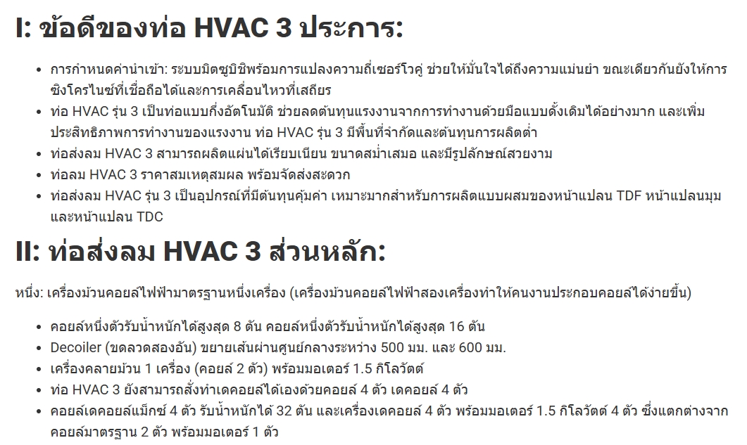 ท่อ HVAC รุ่น 3 ช่วยประหยัดเวลาและต้นทุนแรงงานมากกว่าเดิม และยังประหยัดเวลาในการปิดรอยบาก เจาะร่อง และเฉือนอีกด้วย ทำให้สามารถทำงานแบบกึ่งอัตโนมัติได้อย่างสมบูรณ์ ส่วนการดัดไฮดรอลิกสามารถประหยัดเวลาและแรงงานได้มากขึ้นในการผลิตท่อ TDC หรือท่อหน้าแปลนเหล็กฉาก