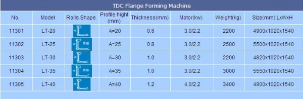 เครื่องขึ้นรูปหน้าแปลน TDC ประหยัดวัสดุ ประสิทธิภาพการทำงานสูง การการเชื่อมต่อที่มั่นคง และอื่นๆ เหมาะอย่างยิ่งสำหรับท่อทั่วไปที่มีหน้าตัดขนาดใหญ่ เครื่องขึ้นรูปหน้าแปลน TDC ประกอบด้วยส่วนหลักๆ คือ เครื่องคลายขดลวด ตัวเครื่องขึ้นรูป และส่วนตัด ส่วนตัดสามารถแบ่งออกเป็น การตัดด้วยล้อเจียรและการตัดด้วยเลื่อยไฟฟ้า และสามารถทำงานได้โดยอัตโนมัติ ความเร็วในการทำงานอยู่ที่ 5-7 เมตร/นาที ตามประสิทธิภาพการทำงาน ความแข็งแรง สามารถแบ่งออกเป็น 5 ประเภท ได้แก่ T-20, T-25, T-30, T-35, T-40 นอกจากนี้ เครื่องจักรหนึ่งชุดที่ผลิตผลิตภัณฑ์ซีรี่ส์ TDC ขนาดเดียว สามารถนำไป เครื่องตัด เครื่องดัด เครื่องพับ เครื่องล็อคแบบพิทส์เบิร์ก เครื่องทำเหล็กฉาก และเครื่องป้อนวัสดุ ท่อที่ผลิตได้นั้นได้มาตรฐาน